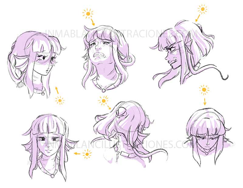 También dejo por aquí un estudio de diferentes expresiones del personaje, variando tanto la perspectiva como de donde procede la iluminación.