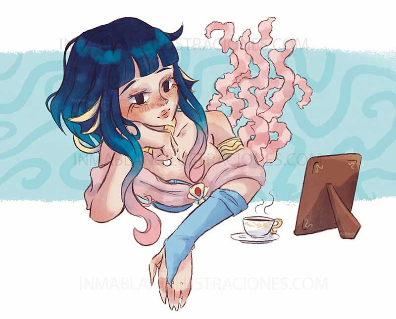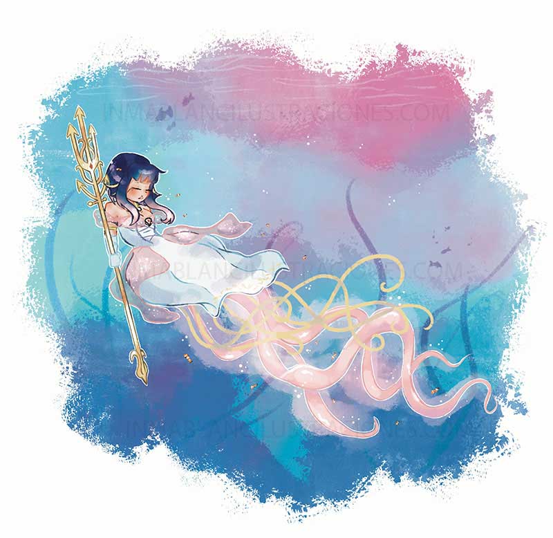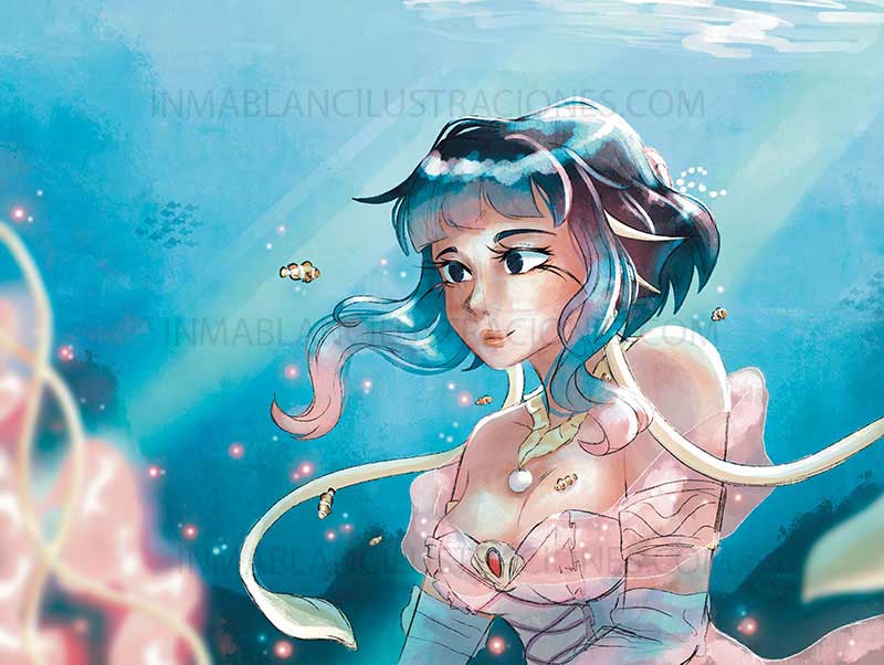 Thoru, la princesa del Reino Eterno fue el primer Oc que creé cuando comencé a interesarme por el arte en mi época de estudiante de instituto. Siempre me ha gustado mucho el mar, en especial las aguas cristalinas, los arrecifes de corales y todos los pececitos que los habitan, por lo que me sentí muy inspirada en todo ello a la hora de crearla. Desde el principio cumplió todos los puntos que quería conseguir en ella, por lo que físicamente con el paso de los años cambió muy poco, solo alguna pequeña variación sobretodo en el vestido, pero su esencia a día de hoy sigue siendo la misma.