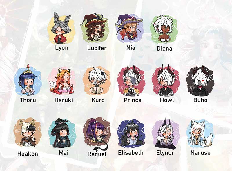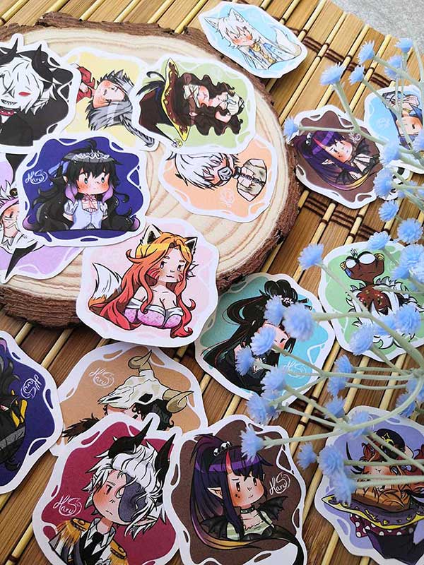 ¡Pack de 17 pegatinas de papel de mis personajes originales! Están dibujados como bustos de chibis metidos en un fondo de manchita de color acorde con la estética del personaje. ¡Darles cariño!