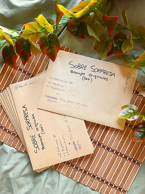Los sobres contienen 2 prints de alta calidad en A5, 1 marcapáginas, 2 pegatinas de mis Oc en versión chibi (Todo el contenido es de arte original, no fanarts, a excepción de lo siguiente: 1 pegatina extra de una de las evoluciones del Pokemon Eevee dentro de un Bubble Tea.